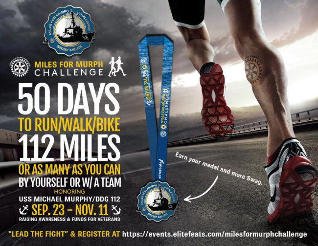 Honor LT Navy SEAL Michael P Murphy and the USS Michael Murphy DDG 112 56 Mile / 112 Mile 50 Day Challenge September 23rd through Veteran’s Day November 11th RACK UP AS MUCH AS YOU CAN IN 50 DAYS! Run/Walk when and where you want then log your miles online. Create a team and log…